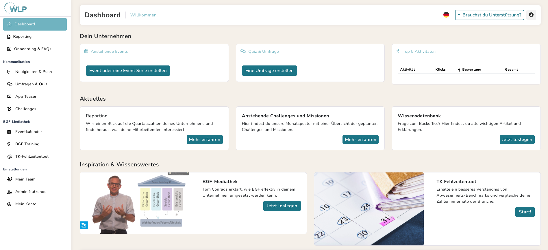 Mit dem WLP Backoffice kannst du deine Maßnahmen zur Gesundheitsförderung zentral steuern und so dein betriebliches Gesundheitsmanagement auf die nächste Stufe bringen. Am besten machst du dich also schnellstmöglich mit allen Funktionen und Services vertraut, damit deinem Start nichts mehr im Weg steht.