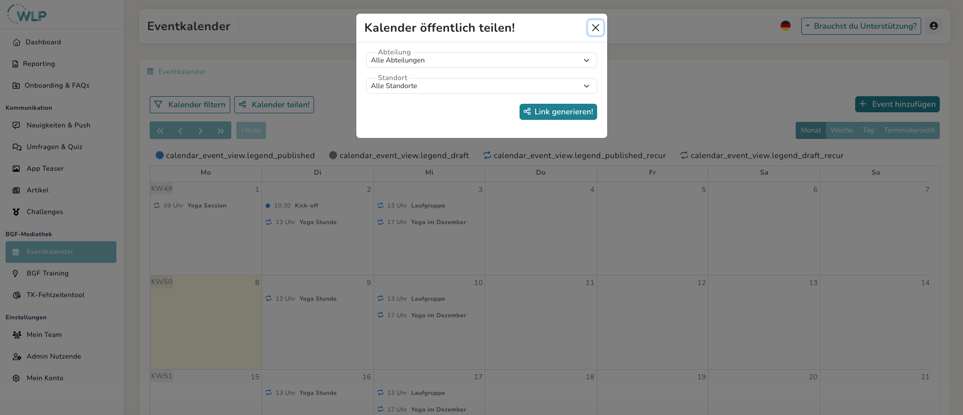 Das WLP Backoffice ermöglicht es dir, deine betrieblichen Gesundheitsmaßnahmen zu planen, steuern und evaluieren, um sie an die Bedürfnisse deiner Mitarbeitenden anzupassen. Das ideale Werkzeug dafür ist der Eventkalender.