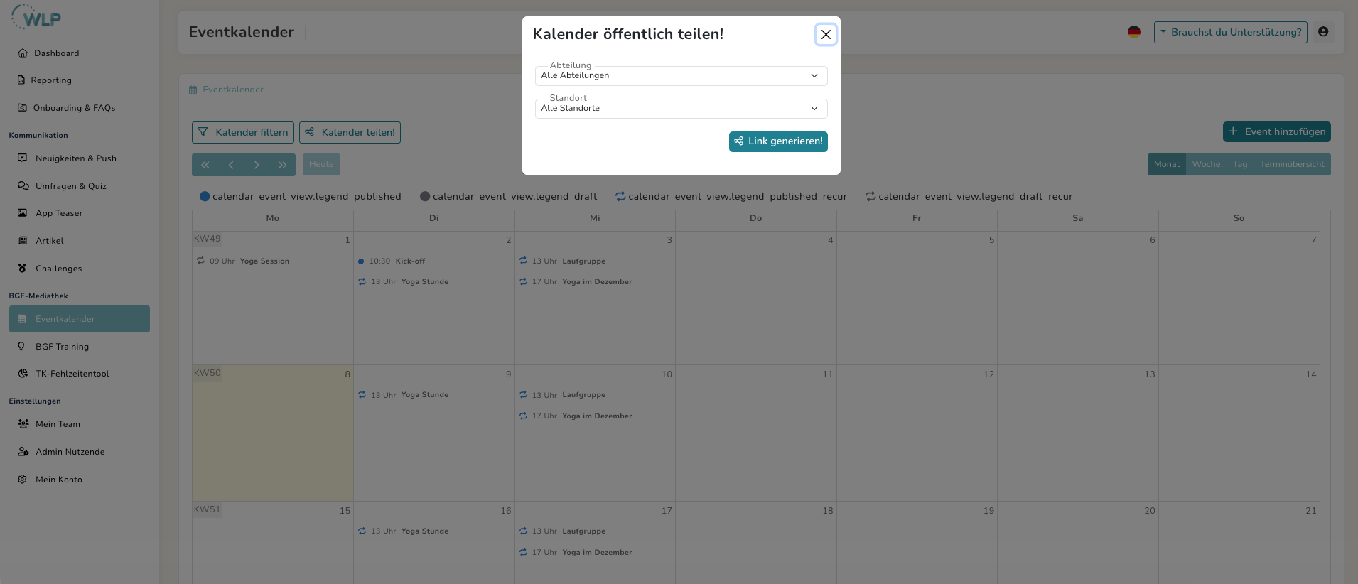 Mit Hilfe des Eventkalenders im WLP Backoffice, kannst du deine betrieblichen Gesundheitsmaßnahmen in der WLP App abbilden und an deine Mitarbeitenden kommunizieren.