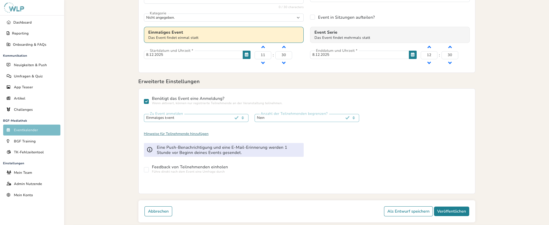 Du möchtest dein Event nicht direkt live schalten? Dann klicke auf “Als Entwurf speichern”, um die Bearbeitung später fortzusetzen.