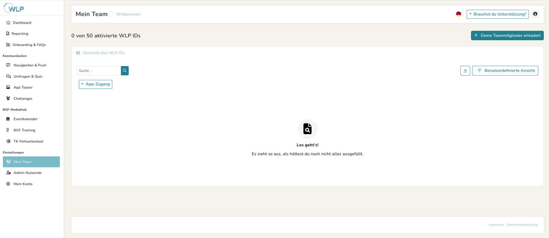 Dieser Bereich des WLP Backoffice ermöglicht es dir, Mitarbeitende zur WLP App einzuladen und den Zugang von gegenwärtigen und ehemaligen Teammitgliedern zu verwalten.