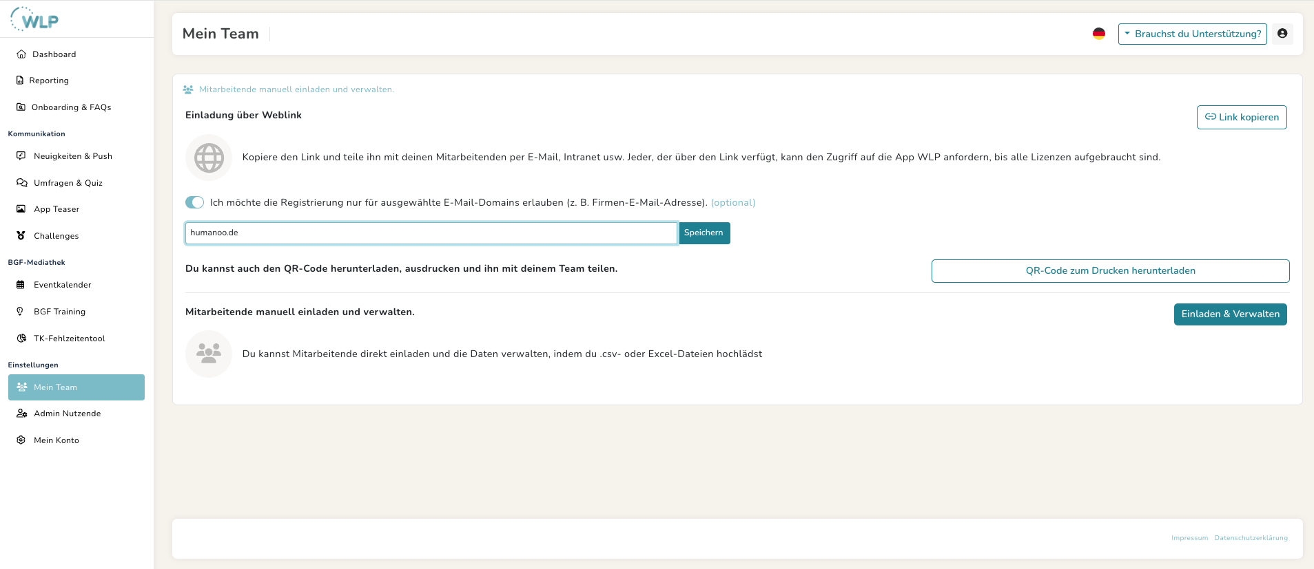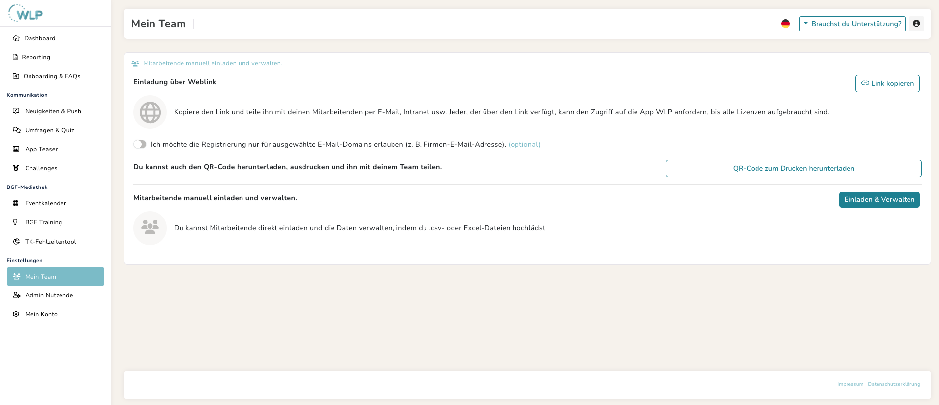 Alle Funktionen und Services, um deine Mitarbeitenden zur WLP App einzuladen erreichst du über die Schaltfläche “Deine Teammitglieder einladen!”. Dir stehen nun zwei Möglichkeiten zur Verfügung:
